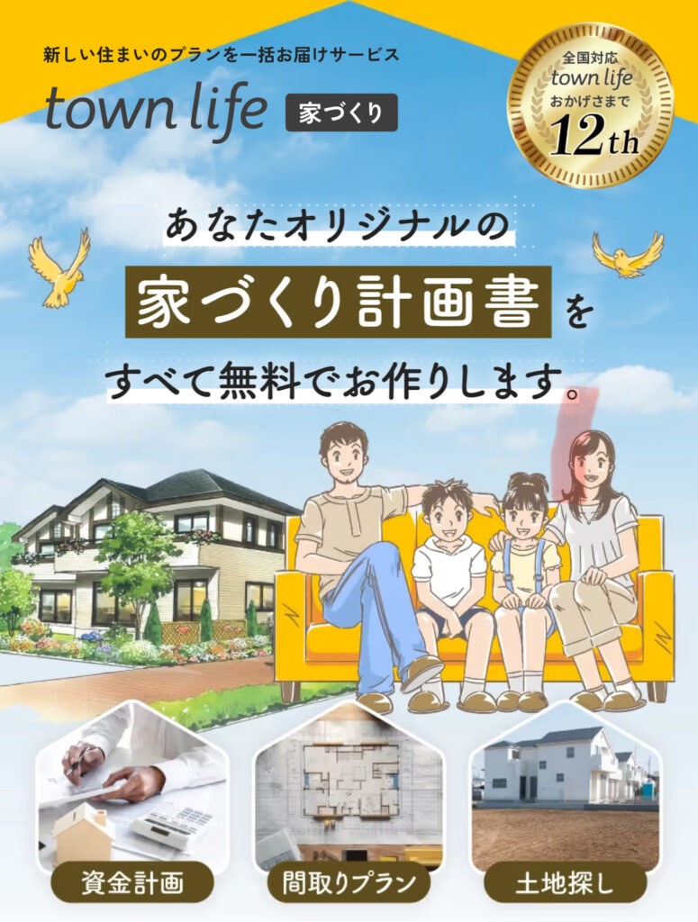 「タウンライフ家づくり」は、住宅メーカーの比較サービスで、複数の住宅メーカーに一括で資料請求や間取りプランの作成を依頼できるサービスです。このサービスは、特に家づくりの初期段階で情報収集を効率的に行いたい人にとって役立ちます。
